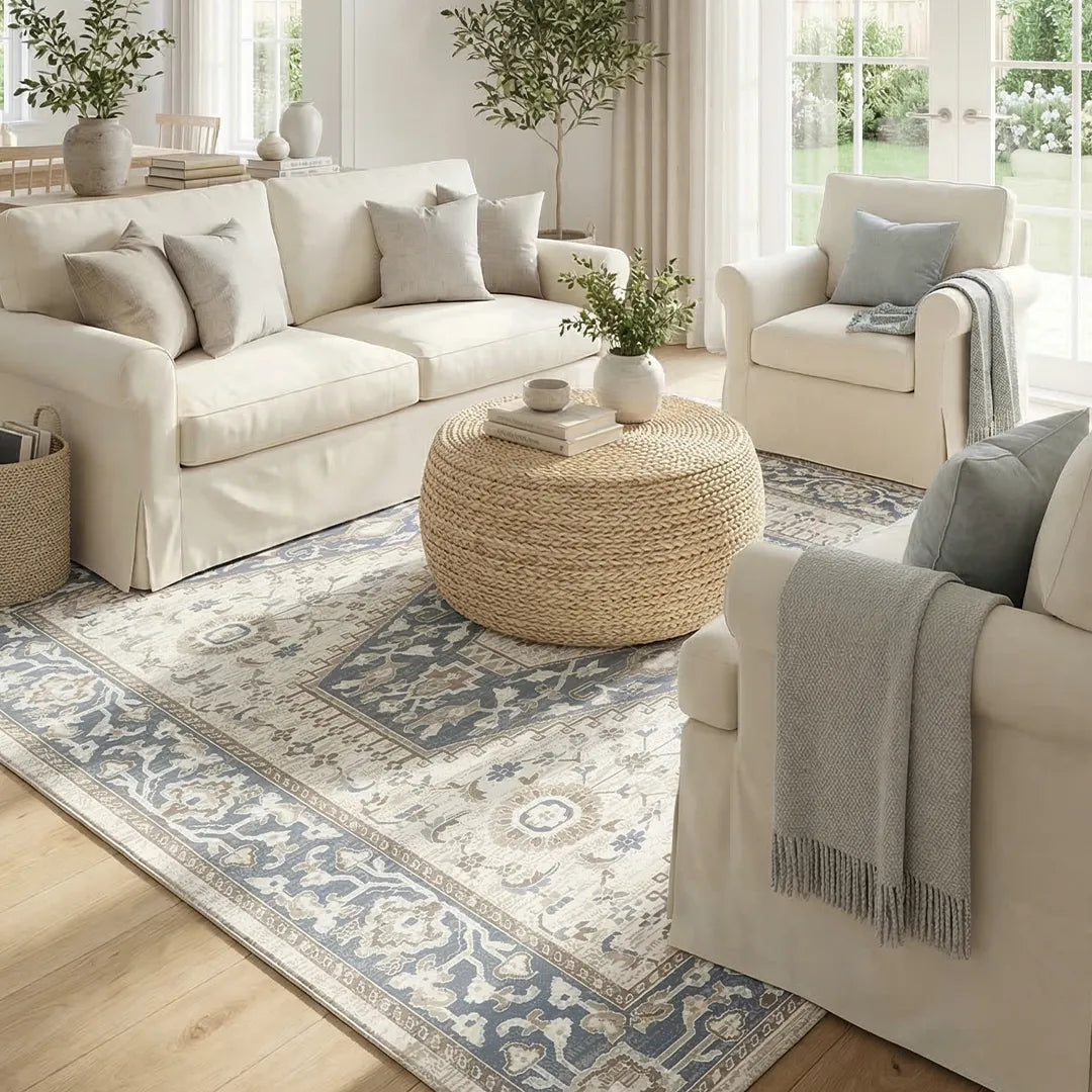 - Ideal under a coffee table in a cozy seating area.