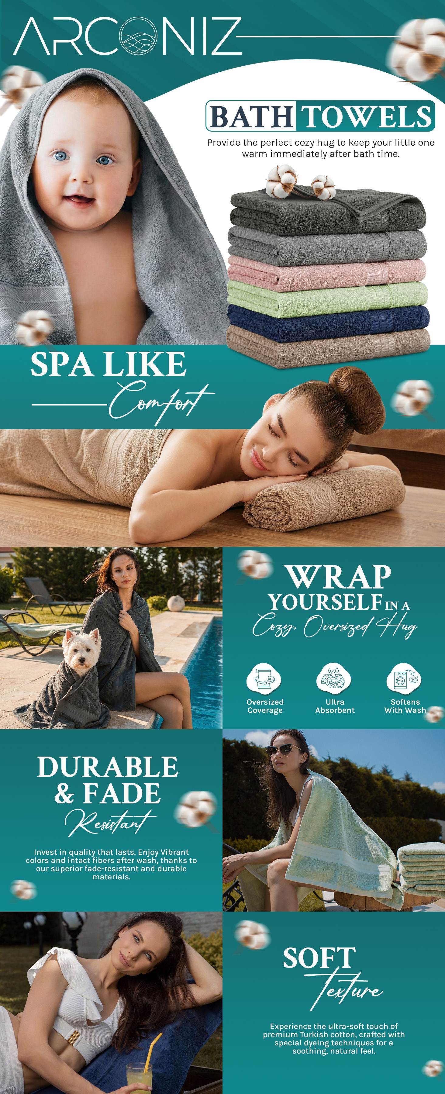 Experience the epitome of luxurious bathing with the Arconiz Turkish Bath Towels. These towels are crafted from superior 100% Turkish micro cotton, renowned for its plush, absorbent qualities and quick-drying capabilities. Each oversized towel is designed to provide a stylish look and a spa-like experience right in your home. With customizable color options to match your bathroom decor and eco-friendly Oeko-Tex certification, these towels blend high-quality, durability, and environmental safety.